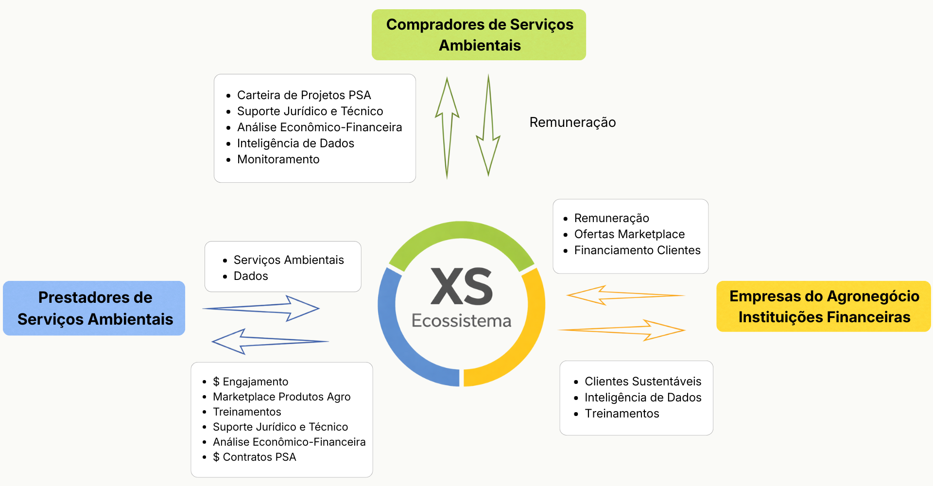 A XStech torna a prestação de serviços ambientais acessível, lucrativa e escalável ao criar um ecossistema que conecta proprietários rurais, empresas do agronegócio, instituições financeiras e compradores de serviços.